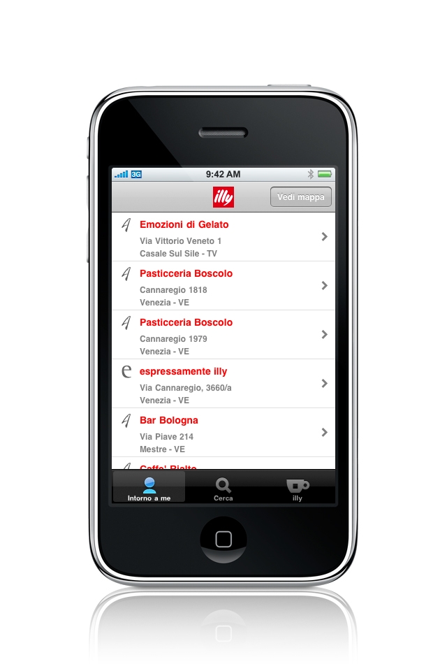 L’applicazione, grazie alla tecnologia di localizzazione di iPhone e iPod Touch, identifica la posizione dell’utente e ricerca, nel database di migliaia di locali illy in tutto il mondo, i 15 più vicini. I risultati sono organizzati per tipologia di locale:
