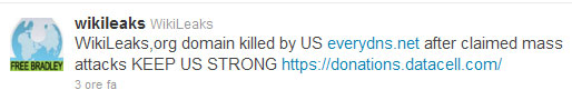 Wikileaks ha lanciato un appello via Twitter, con un link a un sito di donazioni e la scritta”Manteneteci forti”. Un comunicato sul sito di everydns.net, uno dei più grandi siti che forniscono gratuitamente domini Internet, ha reso noto che dalle 4 del mattino ora italiana i servizi per il dominio di Wikileaks sono terminati “in base alle regole sul corretto uso” dei servizi, a causa di una serie di attacchi informatici che potrebbero mettere a rischio l’accesso agli altri 500mila siti gestiti.