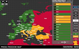 Giallo, segnale di pericolo. Attenzione, perché il nostro paese è l’unico in giallo, tra quelli dell’Europa occidentale. Stiamo insieme con bulgari, albanesi, croati, bosniaci, montenegrini, serbi, nazioni che si sono affacciate alle democrazia soltanto ieri. È verde persino l’Ungheria, che ha adottato una legge sui media caratterizzata da una pesante censura.