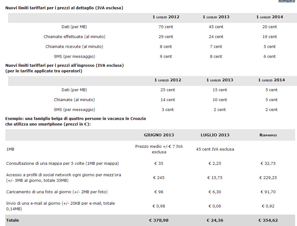 – download di dati o navigazione internet – 45 centesimi/Megabyte (MB) (addebitati per Kilobyte utilizzato) + IVA (-36% rispetto al 2012);