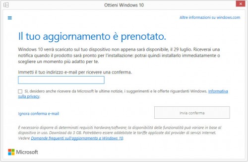 A cosa serve la prenotazione resa possibile da qualche ora? Chi ha “prenotato” Windows 10 tramite il link e il processo indicati alla fine di questa news, riceverà Windows 10 prima del debutto. Cosa significa? Se si dà il consenso, Microsoft scaricherà in anticipo i file del nuovo sistema sul vostro computer, in modo che l’installazione proceda più rapidamente quando ci sarà la notifica di disponibilità. La casa di Redmond fa sapere che l’installazione richiederà circa un’ora, “20 minuti sui nuovi dispositivi e più di un’ora su quelli più vecchi”.